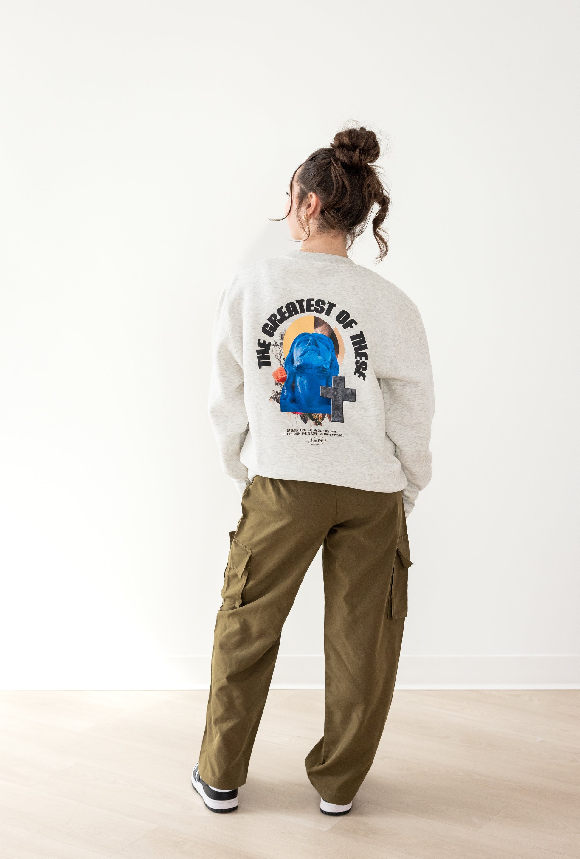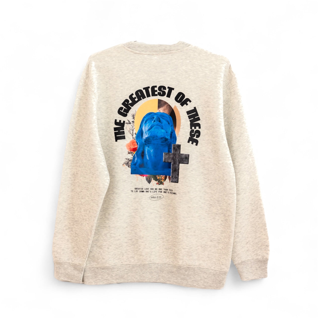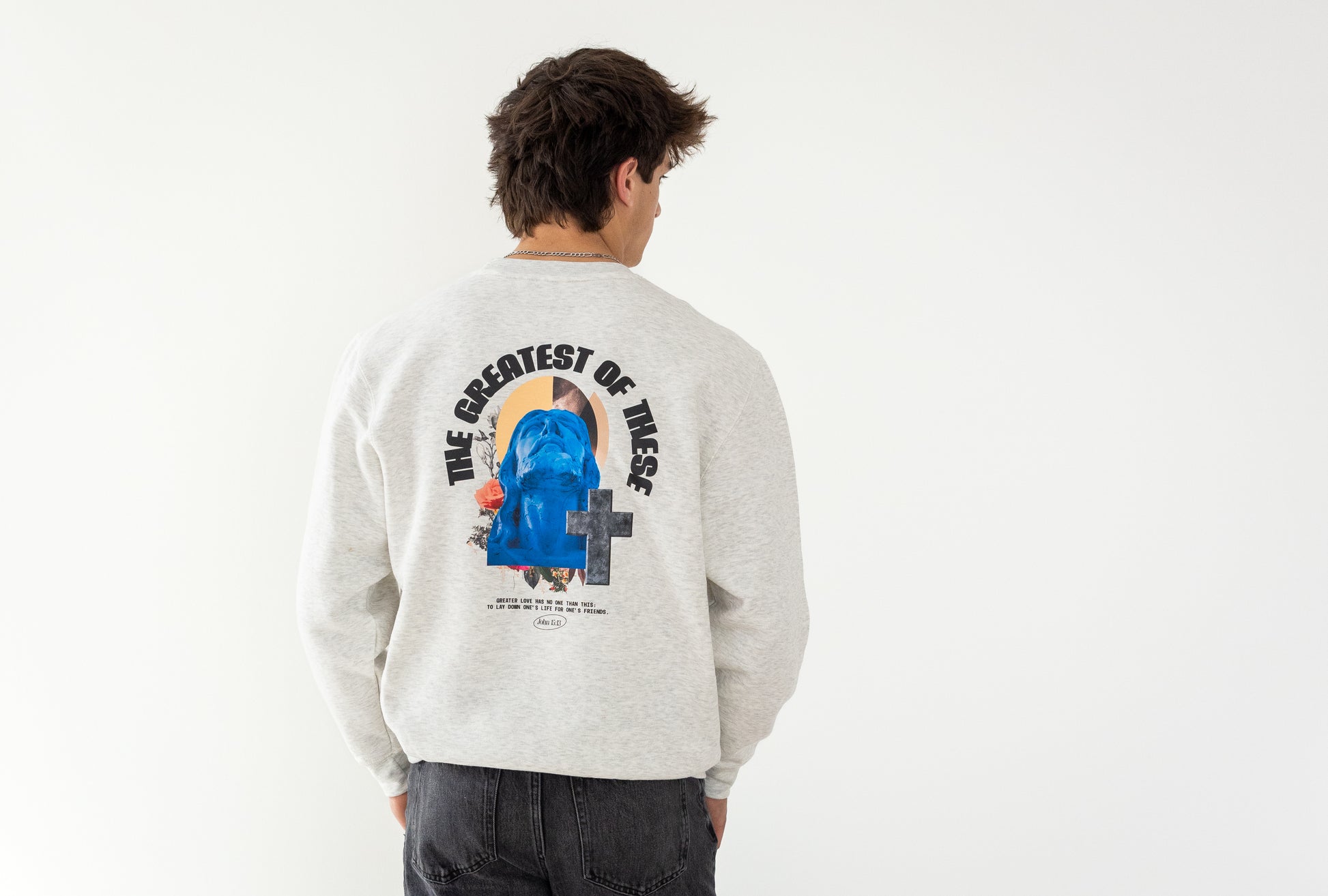 This isn’t just a sweatshirt—it’s a declaration. Inspired by Jesus’ words in John 15:13, the Greater Love Crew carries a striking back design: a vivid blue image of Christ, layered with a bold cross, radiant sunburst, and floral detail. Wrapped around it is the message: “The Greatest of These.”